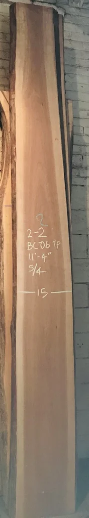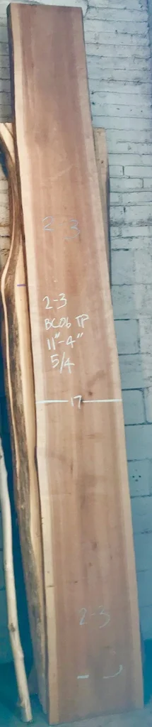 This is material is from ‘dead and down’ trees that we have sourced locally and milled in Bullville, NY. Unless noted, all material has 2 very clean natural edges, is hand-debarked at time of milling and was air dried for at least 2 years before being kiln dried. Note that sapwood has not been heavily steamed and wood tones are bright. Most slabs under 24” wide have been ‘hit-or-miss’ planed on both faces. All slab widths are taken edge-to-edge on narrower face and then averaged over the length of the board.